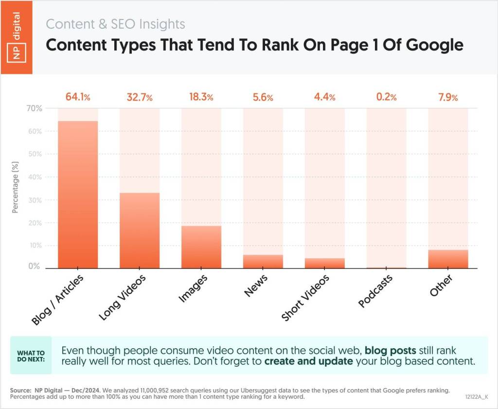 Neil Patel, een bekende SEO-expert, heeft een groot onderzoek gedaan naar welke soorten content het vaakst op pagina 1 van Google staan. Wat blijkt? Blogs blijven belangrijk, maar video’s en afbeeldingen worden steeds waardevoller. Tijd om daar iets mee te doen.